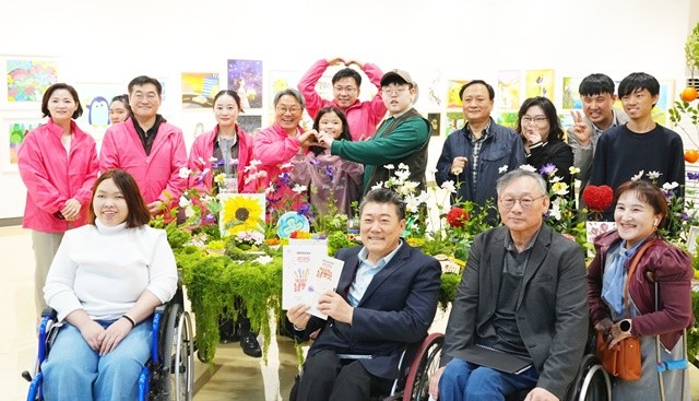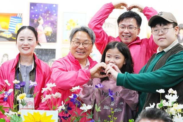 강기정 광주광역시장이 6일 오후 남구 빛고을시민문화관에서 열린 '2025 예술날개 페스티벌 개막식'에 참석해 전시작품을 둘러본 뒤 장애 예술인 등과 기념촬영을 하고 있다./광주광역시 제공