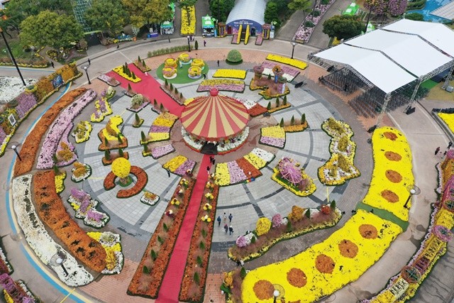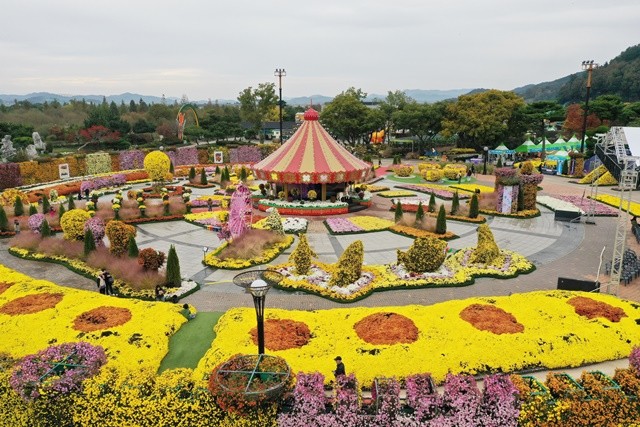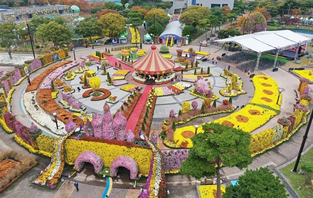 중앙광장에는 회전목마와 대관람차를 포함한 대형 국화 조형물이 관람객을 맞는다. ‘마법의 성’, ‘전시컵’, ‘뽀로로와 친구들’, 공룡·동물 캐릭터 등 95점의 조형물이 동화 속 놀이공원을 연상시킨다.