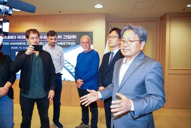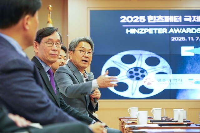[위키트리 광주전남취재본부 노해섭 기자]강기정 광주광역시장이 7일 오전 시청 비즈니스룸에서 제5회 힌츠페터국제보도상 수상자들과 간담회를 하고 있다./광주광역시 제공