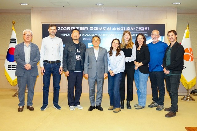 강기정 광주광역시장이 7일 오전 시청 비즈니스룸에서 제5회 힌츠페터국제보도상 수상자들과 간담회를 한 뒤 기념촬영을 하고 있다./광주광역시 제공