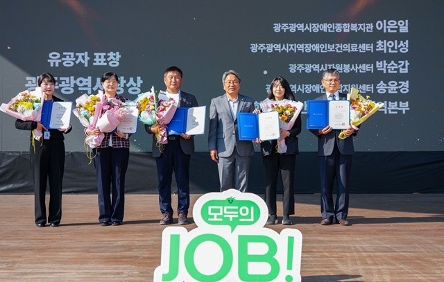 강기정 광주광역시장이 7일 오전 시청 야외광장에서 열린 '2025 장애인복지 통합박람회'에 참석해 유공자 표창을 한 뒤 기념촬영을 하고 있다./광주광역시 제공