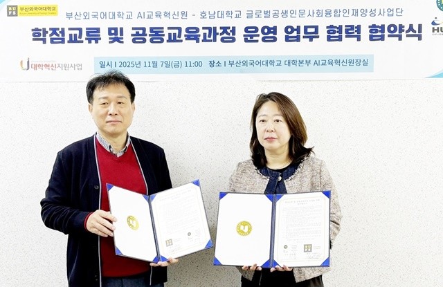 [위키트리 광주전남취재본부 노해섭 기자] 호남대학교 글로벌공생 인문사회융합인재양성사업단(HUSS, 단장 송창수)은 11월 7일 부산외국어대학교에서 부산외국어대학교 AI교육혁신원과 업무협약(MOU)을 체결하고, 대학 간 실질적인 학점 교류 및 공동교육과정 운영 방안을 논의했다.