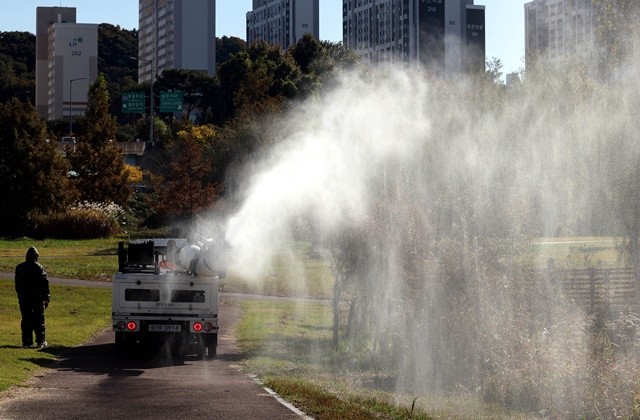 [위키트리 광주전남취재본부 노해섭 기자] 10일 광주시 북구 동림동 산동교 친수공원 영산강 일대에서 북구청 동물정책팀 직원들이 철새 도래 시기를 대비해 고병원성 조류인플루엔자(AI) 예방을 위해 방역을 실시하고 있다. 최근 조류인플루엔자 확인이 빈번하게 발생함에 따라 농림축산식품부는 바이러스 접촉 가능성이 있는 철새도래지 등 출입을 삼가고 기본적 방역 수칙을 준수해 달라고 당부했다.
