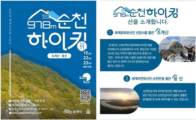 시 관계자는 “978m 하이킹은 순천의 자연과 세계유산, 그리고 사람의 이야기가 하나로 이어지는 순천형 웰니스 관광 콘텐츠”라며, “자연과 사람이 함께 숨 쉬는 도시 순천의 진정한 매력을 알리고, 소규모 프리미엄 관광을 통한 고부가가치 생태관광의 새로운 방향을 제시하겠다”고 밝혔다.