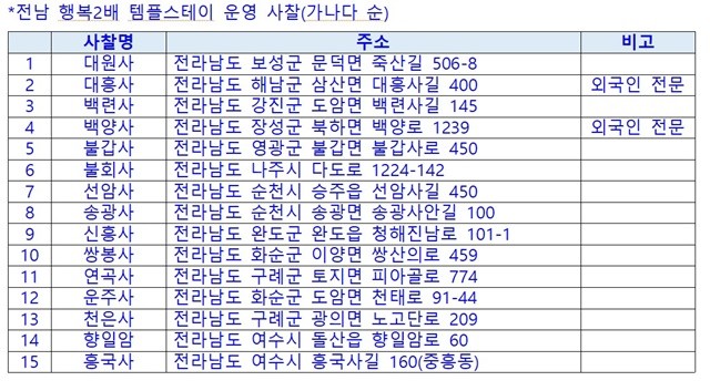 전남도,11월 한 달 동안 남도 사찰 템플스테이 참가비 50% 할인