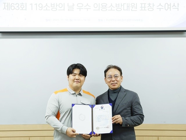 [위키트리 광주전남취재본부 노해섭 기자] 호남대학교 소방행정학과(학과장 노선균)의 대학생전문의용소방대(대장 강웅일) 소속 박주현(4학년) 학생이 ‘제63주년 119 소방의 날’ 우수 의용소방대원으로 선정돼 광산소방서장 표창을 수상했다.