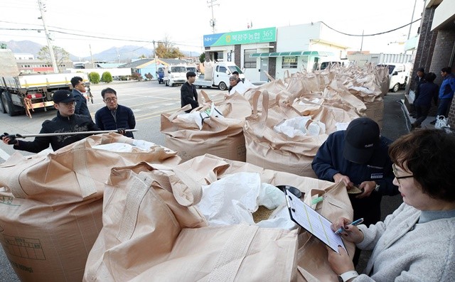 [위키트리 광주전남취재본부 노해섭 기자]11일 광주시 북구 건국동 북광주농협 우치동지점에서 식량위기 대응과 쌀값안정을 위해 시행하는 2025년산 공공비축미곡 매입 현장에서 북구청 도시농업팀 직원과 국립농산물 품질관리원들이 올해 수확한 벼의 품질을 살펴보고 있다. 이날 총 매입량은 102400kg이다.