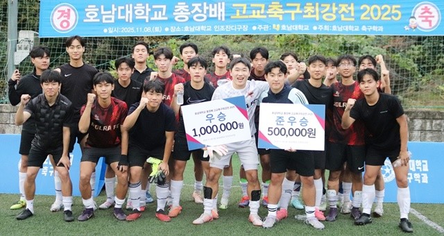 [위키트리 광주전남취재본부 노해섭 기자]호남대학교 축구학과(학과장 장재훈)가 11월 1일 교내 인조잔디구장에서 광주·전남 지역 10개 고등학교 팀이 참가해 열띤 경쟁을 펼친 ‘총장배 고교축구최강전 2025’ 결과 지역 고등학교 연합팀 FC몰라가 우승과 함께 상금 100만원을 차지했고, FC오드롱이 준우승, 광양고와 삼애FC가 공동 3위를 차지했다.
