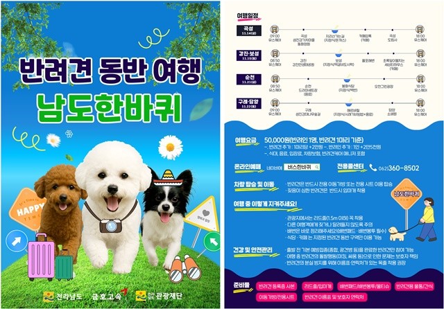 최근 반려동물을 가족처럼 여기는 ‘펫팸족(Pet+Family)’이 늘어남에 따라 기획한 이번 코스는 반려견과 함께 남도의 자연과 명소를 둘러보는 여행상품이다. 왕복 교통비, 식·음료, 관광지 입장료 등이 포함된 5만 원의 합리적 요금으로 운영된다.