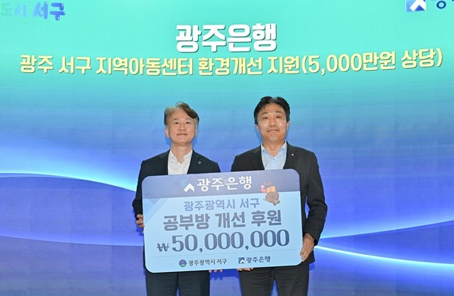 [위키트리 광주전남취재본부 노해섭 기자]광주시 서구(구청장 김이강)는 11일 서구청 1층 기부자 명예의 전당에서 광주은행(은행장 고병일)로부터 지역아동센터 환경개보수 지원을 위한 5000만원 상당의 ‘희망이 꽃피는 공부방’ 후원금 전달식을 가졌다./ 광주 서구 제공