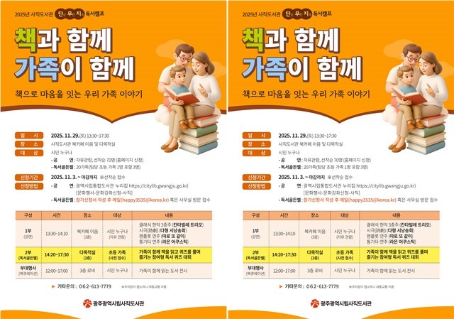 조인숙 사직도서관리장은 “이번 독서행사는 가족이 함께 책을 읽고 마음을 나누며, 도서관을 중심으로 지역 공동체의 유대감을 강화하는 시간이 될 것”이라며 “관심 있는 시민들의 많은 참여를 바란다”고 말했다.