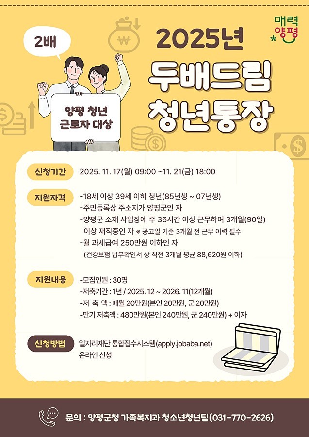 경기 양평군(군수 전진선)은 청년들의 자립과 미래 설계 기반 마련을 위해 ‘두배드림 청년통장’ 사업을 추진한다고 밝혔다.