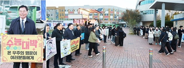 [위키트리 광주전남취재본부 노해섭 기자]전남 무안군(군수 김산)은 13일 2026학년도 대학수학능력시험을 맞아 무안고등학교 등 관내 수능 고사장 앞에서 ‘길거리 수능응원’을 진행했다.