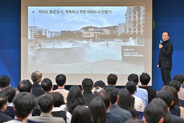광주시 서구(구청장 김이강)는 13일 서구청 들불홀에서 강범준 교수를 초청해 ‘작아도 좋은 도시, 똑똑하고 착한 미래도시 만들기’ 주제로 직원 대상 강의를 개최했다./광주 서구 제공