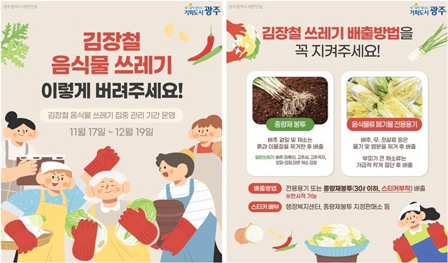 [위키트리 광주전남취재본부 노해섭 기자]광주광역시(시장 강기정)는 본격적인 김장철을 맞아 오는 11월17일부터 12월19일까지 ‘김장철 음식물쓰레기 집중 관리 기간’으로 운영, 김장용 채소류에 한해 스티커 부착 종량제봉투 배출을 한시적으로 허용한다.