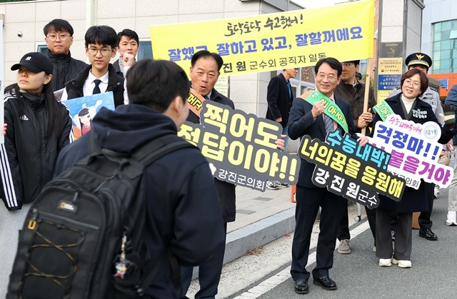 [위키트리 광주전남취재본부 노해섭 기자]13일, 2026학년도 대학수학능력시험이 치러진 강진고 교문 앞. 강진원 강진군수는 아침 일찍부터 학부모와 교직원, 후배 학생들과 함께 수험생을 맞이하며 응원과 격려를 보냈다. 강 군수는 “그동안의 노력이 결실로 이어지는 날이 되길 바란다”며 “군에서도 여러분의 꿈 실현에 아낌없는 지원을 하겠다”고 약속했다.
