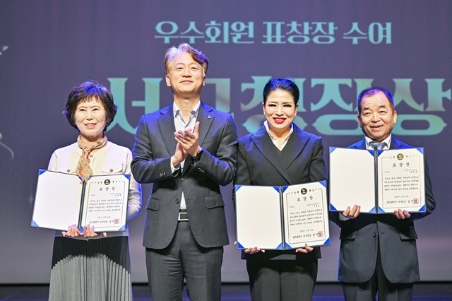 김이강 광주 서구청장이 14일 서빛마루문화예술회관에서 열린 ‘서빛예술제&서빛전시회’에서 우수회원 표창장을 수여한 후 기념촬영을 하고 있다. 광주 서구 제공