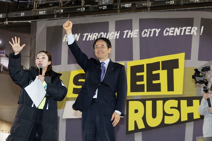 이동환 고양특례시장이 지난 15일 열린 ‘2025 고양 스트릿 러쉬 in 라페스타’에서 “불빛과 사람이 가득한 도심 속을 시원하게 질주하며 열정 가득한 순간을 만끽하길 바란다”고 말하고, 선수들의 레이스를 관람하며 응원을 보냈다.