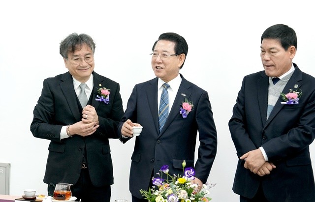 김영록 전라남도지사가 16일 담양문화회관에서 열린 ‘제46회 남도국악제 개막식’ 행사에서 주요 내빈들과 환담을 하고 있다.