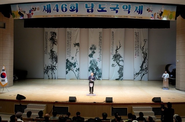 김영록 전라남도지사가 16일 담양문화회관에서 열린 ‘제46회 남도국악제 개막식’ 행사에서 인사말을 하고 있다.