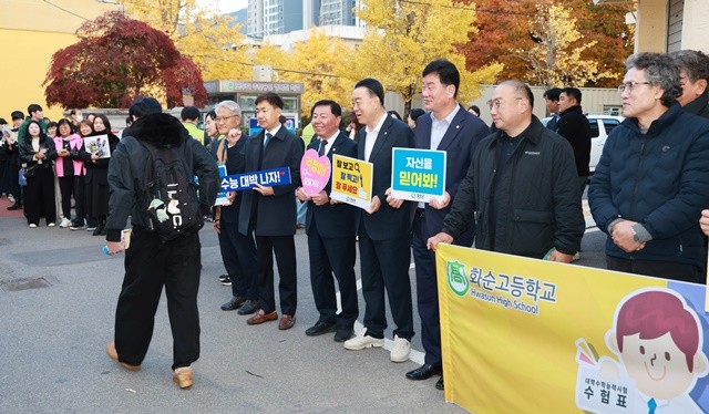이날 아침 시험장 주변에는 구복규 군수와 화순군의회, 화순교육지원청, 학부모 연합회, 지역 주민 등 다양한 관계자들이 함께해 학생들에게 응원의 메시지를 전했다.