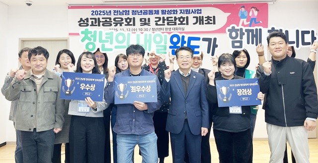 [위키트리 광주전남취재본부 노해섭 기자]완도군이 12일 청년센터 ‘완생’에서 ‘2025년 전남형 청년 공동체 활성화 사업 성과 공유회’를 열고, 올 한 해 지역 청년들의 활약을 돌아보는 시간을 가졌다. 이번 사업은 청년들이 지역 문제를 해결하고 성장 기반을 마련할 수 있도록 돕는 것이 목적이다.