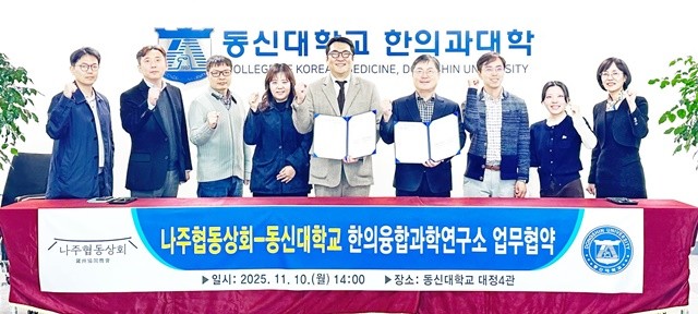 동신대학교 한의융합과학연구소(소장 정현우)는 최근 동신대 대정4관에서 나주협동상회(대표 윤현석)와 나주 전통 약재와 지역 유산을 활용한 브랜드 공동 개발을 위한 협약을 체결했다.