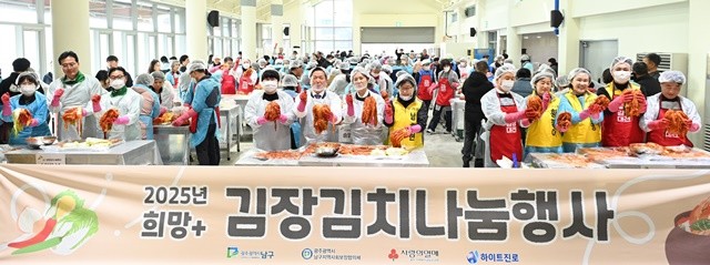 [위키트리 광주전남취재본부 노해섭 기자]광주시 남구는 18일 오후 광주김치타운에서 김병내 남구청장을 비롯한 남구지역사회보장협의체 이선미 민간위원장, 동 지사협 위원 및 담당자 등 150여 명이 참여한 가운데 ‘2525 희망+김장김치 나눔행사’를 개최했다. 이날 행사는 하이트진로㈜ 특판광주지점(지점장 김대곤)의 후원으로 마련되었으며, 관내 취약계층 510세대에 세대당 5kg(총 2,550kg)씩 전달할 예정이다.