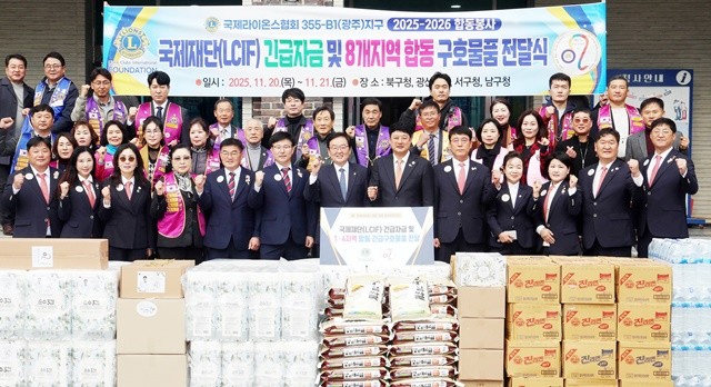 광주시 북구(청장 문인)는 20일 구청 광장에서 국제라이온스협회 355-B1지구(총재 김연호)로부터 지역 돌봄이웃 지원을 위한 백미, 라면, 생수, 이불 등 총 9,374,040원 상당의 후원물품을 기탁받았다.