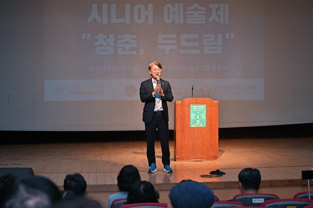 [위키트리 광주전남취재본부 노해섭 기자]김이강 광주 서구청장이 20일 서구문화센터 공연장에서 열린 시니어 예술제 ‘청춘, 두드림’에서 인사말을 하고 있다. 광주 서구 제공
