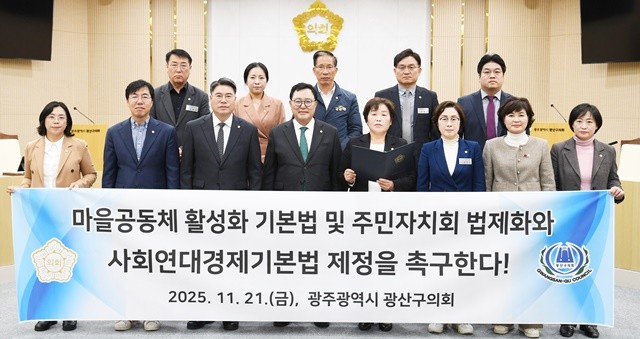 [위키트리 광주전남취재본부 노해섭 기자]차가운 시멘트 벽에 갇혀 이웃의 얼굴조차 잊고 살아가는 ‘각자도생’의 시대. 광주시 광산구의회가 “이대로는 안 된다”며 ‘공동체 회복’이라는 시대적 화두를 들고나왔다. 지난 21일, 광산구의회는 단순한 조례가 아닌, 국가적 차원의 법률 제정을 통해 무너진 풀뿌리 자치를 되살리고, 사람의 온기가 넘치는 따뜻한 경제를 만들자고 국회와 정부에 강력히 촉구하고 나섰다.