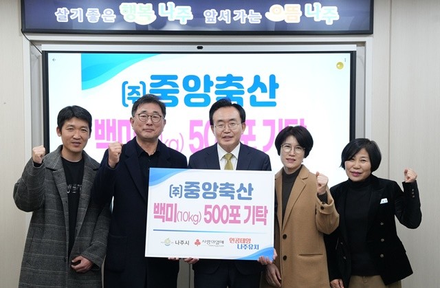 [위키트리 광주전남취재본부 노해섭 기자] 전남 나주시가 지역기업 ㈜중앙축산으로부터 사회복지시설과 취약계층을 위한 백미 500포 기탁을 받아 겨울철 생활안정을 위한 나눔 확산에 나섰다.
