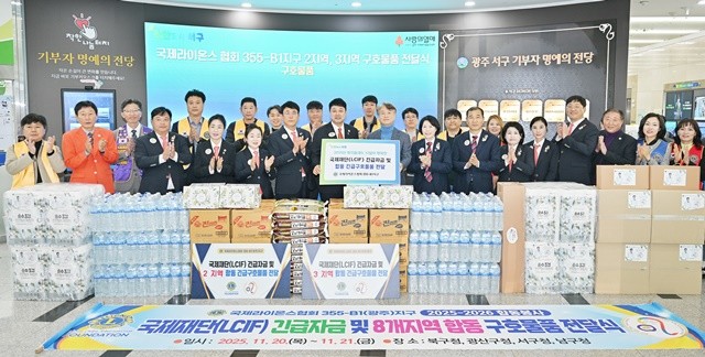 [위키트리 광주전남취재본부 노해섭 기자]광주시 서구(구청장 김이강)는 21일 서구청 1층 기부자 명예의전당에서 국제라이온스 협회 355-B1지구(B1지구 총재 김경종)로부터 지난 7월 여름철 집중호우 피해세대 지원을 위한 백미400kg, 라면40박스 등 630만원 상당의 구호물품을 기탁 받았다. 광주 서구 제공