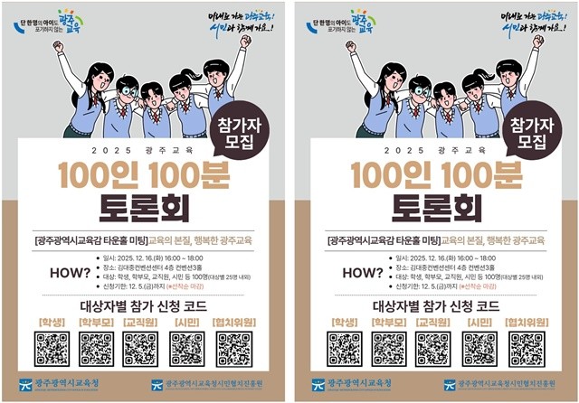 [위키트리 광주전남취재본부 노해섭 기자]광주시교육청시민협치진흥원(이하 시민협치진흥원)은 오는 12월 16일 김대중컨벤션센터 4층 컨벤션홀에서 ‘2025 광주교육 100인 100분 토론회’를 개최한다.