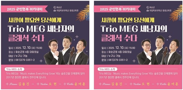 [위키트리 광주전남취재본부 노해섭 기자]화순군(군수 구복규)은 '2025 군민행복 아카데미의 마지막 10회차 강연을 오는 12월 10일(수) 오후 3시에 화순군청 4층 대회의실에서 개최한다고 밝혔다.이번 강연은 클래식 연주단체 Trio MEG를 초청해 ‘사랑이 필요한 당신에게 – Trio MEG 세 남자의 클래식 수다’를 주제로 진행된다.