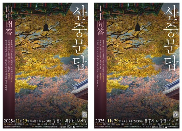 [위키트리 광주전남취재본부 노해섭 기자]담양군문화재단은 11월 29일 오후 2시 30분, 담양 월산면 용흥사에서 인문콘서트 「산중문답(山中聞答)」을 개최한다고 밝혔다. 이번 행사는 고즈넉한 사찰 공간을 배경으로, 역사문화와 예술이 어우러지는 특별한 프로그램으로 기획되었다.