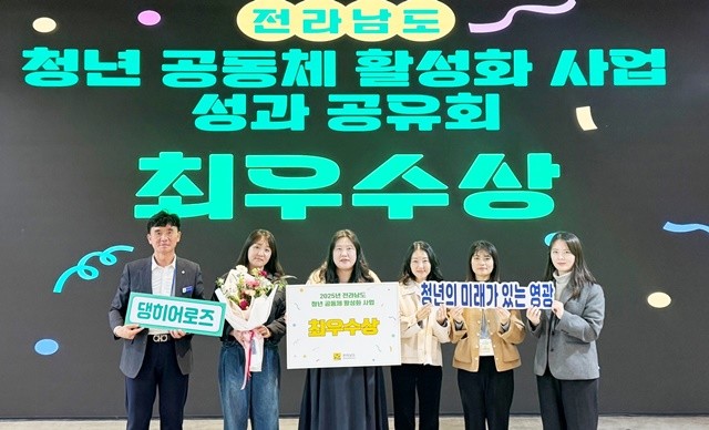 [위키트리 광주전남취재본부 노해섭 기자]영광군 청년공동체 댕히어로즈(대표 조아라)가 11월 21일 열린 전라남도 청년공동체 활성화사업 성과공유회에서 도내 20개 시·군 청년공동체 가운데 최우수상을 수상했다.