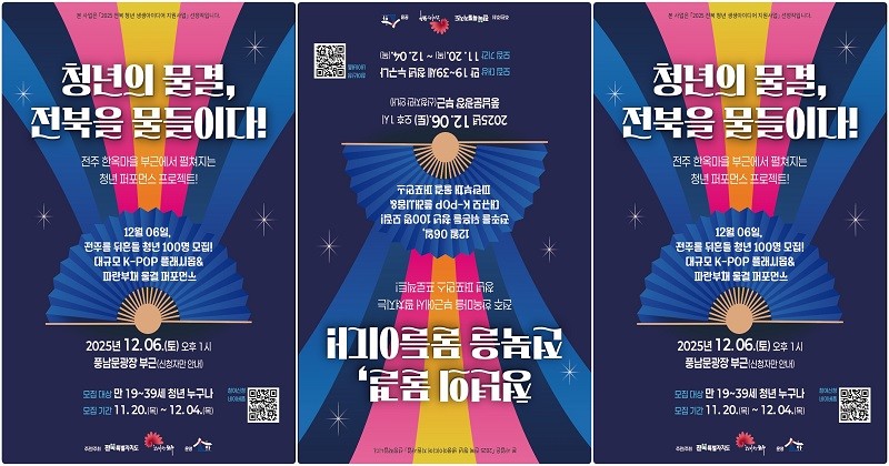 오는 12월 6일(토) 오후 1시, 전주 풍남문광장과 한옥마을 일대에서 전북 청년 100명이 참여하는 대규모 플래시몹 ‘청년의 물결, 전북을 물들이다’가 펼쳐진다. 이번 행사는 전북에 거주하거나 방문하는 만 19세~39세 청년들이 주체가 되어 지역 문화와 청년 에너지를 창의적으로 표현하는 자리다.