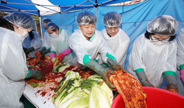 [위키트리 광주전남취재본부 노해섭 기자]25일 광주시 북구 운암1동 행정복지센터 주차장에서 열린 사랑의 김장김치 나눔행사에 참가한 서강중학교 학생들이 자생단체 회원들과 지역 돌봄이웃 250세대에 전달할 김치를 담고 있다.