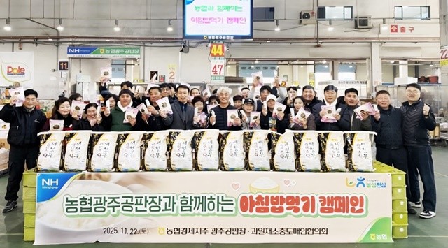 [위키트리 광주전남취재본부 노해섭 기자] 농협경제지주 광주공판장(장장 박창욱)은 지난 22일 공판장 내에서 과일채소중도매인협의회 및 협력업체 종사자들과 함께「농심천심! 우리쌀 아침밥 먹기 캠페인 행사」를 진행했다.