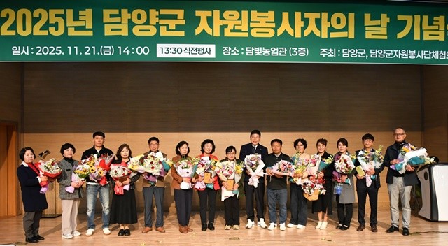 [위키트리 광주전남취재본부 노해섭 기자] 담양군은 21일 담빛농업관에서 자원봉사자 200여 명이 참석한 가운데 ‘2025 담양군자원봉사자 기념식’을 열고 올해 지역에서 활동한 자원봉사자들의 노고를 격려했다.