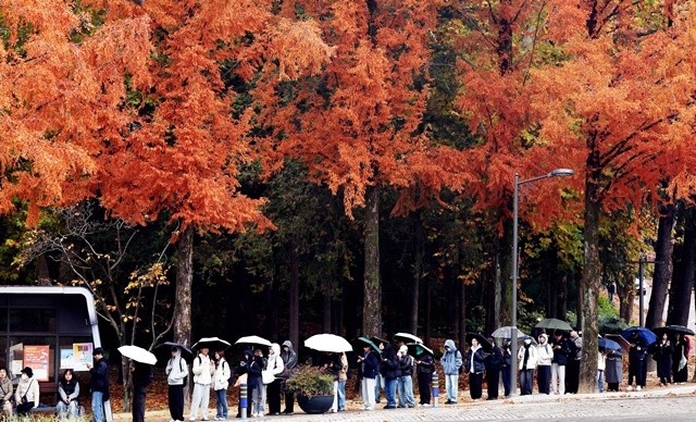 [위키트리 광주전남취재본부 노해섭 기자]25일, 광주시 북구 전남대학교 교정의 한 버스정류장. 계절은, 잠시 이곳에 자신의 모든 것을 쏟아붓고 있었다. 마치 마지막 불꽃을 태우듯, 새빨갛게 타오르는 메타세쿼이아의 열정 위로, 차가운 가을비가 소리 없이 내려앉으며 세상에서 가장 아름다운 수채화 한 폭을 그려내고 있었다.