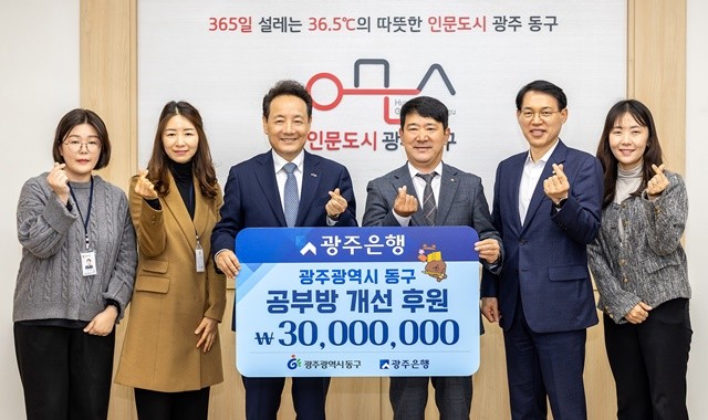 [위키트리 광주전남취재본부 노해섭 기자]광주은행(은행장 고병일)은 25일, 광주시 동구청에서 ‘희망이 꽃피는 공부방’ 사업을 위한 후원금 3천만 원을 기탁했다고 밝혔다. 기탁식에는 광주은행 김재춘 부행장과 임택 동구청장 등 관계자들이 참석해 나눔의 의미를 함께했다.