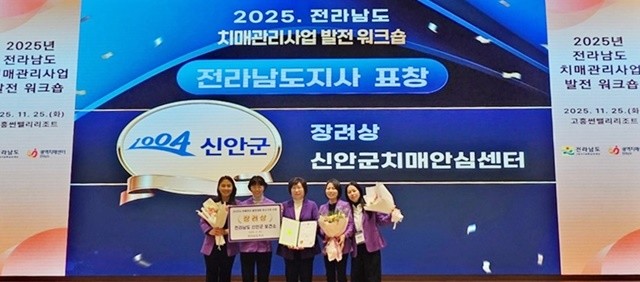 [위키트리 광주전남취재본부 노해섭 기자]신안군 치매안심센터(보건소장 김현희)가 25일 고흥군에서 열린 ‘2025년 전라남도 치매관리사업 발전대회’에서 도내 22개 시·군 보건소 중 우수기관으로 선정돼 전라남도지사 기관표창을 수상했다.