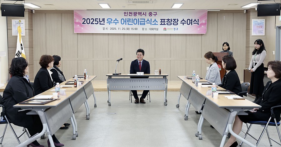 인천시 중구(구청장 김정헌)는 올 한 해 어린이 급식환경 개선에 앞장선 모범 어린이급식소에 대한 노고를 격려하고자 지난 25일 중구 제2청 회의실에서 ‘2025년 우수 어린이급식소 표창장 수여식’을 개최했다.