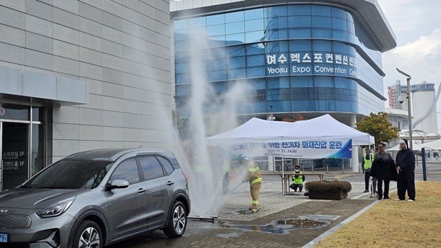 훈련에는 여수박람회장 자위소방대원과 공사 직원 등 30여 명이 참여했으며, 전기차 배터리 열폭주 발생 상황을 가상 시나리오로 설정해 △현장 초기 대응 △차량 하부 집중 방수(放水) △배터리 재발화 방지 등 단계별 절차를 점검했다.