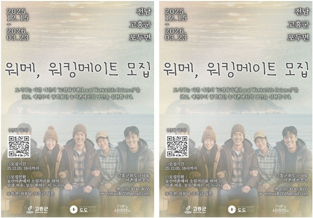 [위키트리 광주전남취재본부 노해섭 기자]고흥군(군수 공영민)은 고흥군 취도·금사항 어촌신활력증진사업 앵커조직 활동의 일환으로, 농어촌의 계절별 일거리와 산업을 조합해서 일 경험과 지역 체류를 함께 제공하는 ‘워-메(Working-Mate)’ 프로그램을 시행한다고 밝혔다.