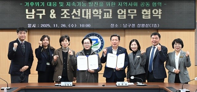 [위키트리 광주전남취재본부 노해섭 기자]광주시 남구는 26일 오전 구청 상황실에서 지역사회의 기후위기 대응 협력 강화 및 지자체-대학 간 지속가능 발전 체계 구축을 위해 기후위기 대응 및 지속가능발전 업무협약을 체결했다. 김병내 남구청장과 조선대 기후위기대응 융합인재양성사업단 강희숙 단장 등 양 기관 참석자들이 기념 촬영을 하고 있다.