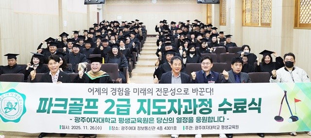 [위키트리 광주전남취재본부 노해섭 기자]광주여자대학교(총장 이선재) 평생교육원은 26일, ‘어제의 경험을 미래의 전문성으로 바꾼다!’라는 주제로 파크골프 2급 지도자과정 수료식을 성황리에 개최했다고 밝혔다. 이번 수료식은 수료생들의 노력과 성과를 기념하고, 평생교육을 통한 지역사회 기여의 의지를 다지는 자리였다.