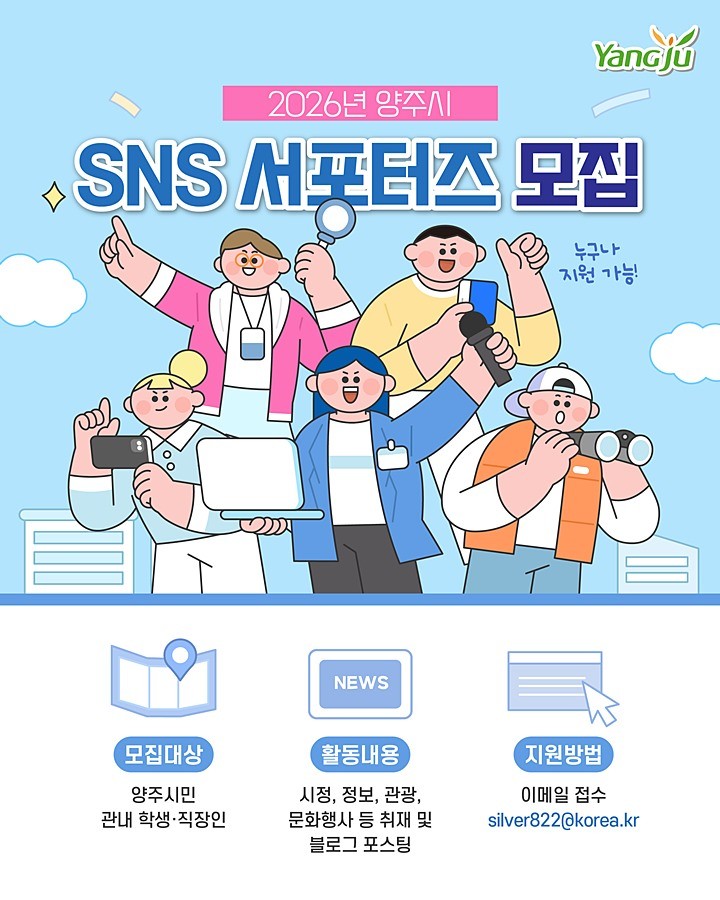 경기 양주시(시장 강수현)가 시민과 소통하며 시정 소식과 지역의 숨은 매력을 널리 알릴 「2026년 양주시 SNS 서포터즈」를 오는 12월 1일(월)부터 10일(수)까지 10일간 모집한다.